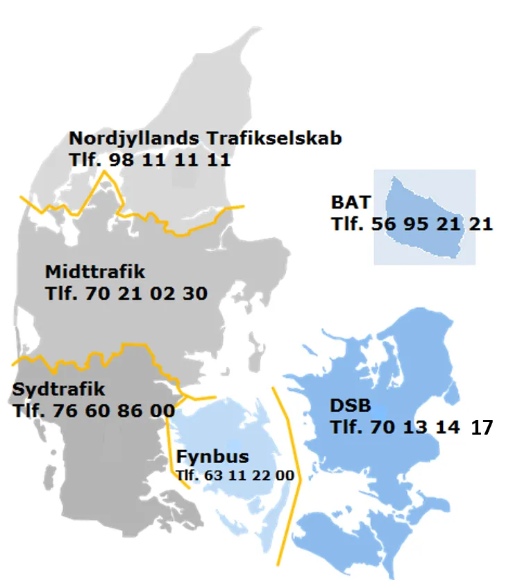 Hvis din rejsestrækning med tog krydser inddelingerne på kortet herunder, skal du kontakte trafikselskabet DSB.